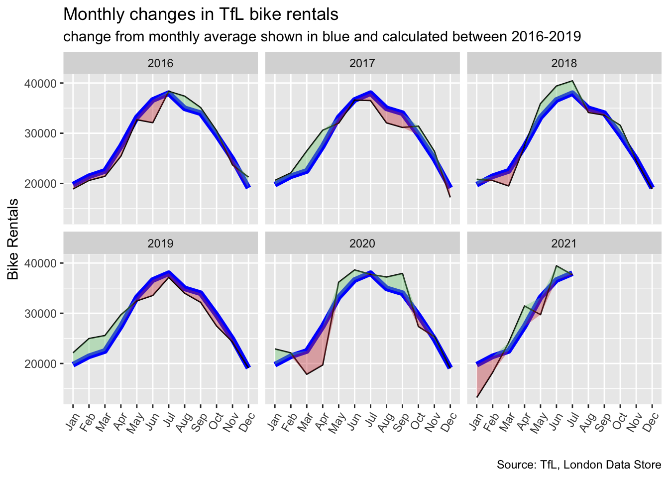 We will now reproduce the following graph. The graph looks at the monthly change in TfL from the monthly averages calculated in 2016-2019. The blue line is the mean bike rentals of the months over 2016-2019. The red shaded region shows the months where the monthly rentals fell below the average and the green shows the months where it was above the average.