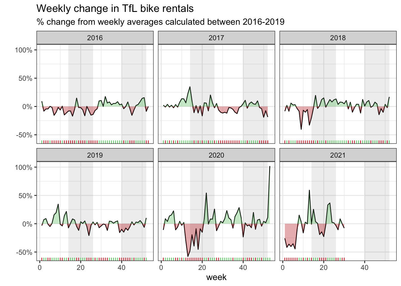 The second graph we recreated looks at percentage change from the expected level of weekly rentals. The two grey shaded rectangles correspond to Q2 (weeks 14-26) and Q4 (weeks 40-52).